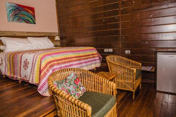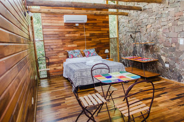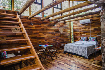 Cabaña Loft sin divisiones internas (solo el Baño). Dos plantas y balcon privado en contacto directo con el monte nativo. La habitación cuenta con somier de dos plazas, o dos sommiers de una plaza, aire acondicionado frio/calor.